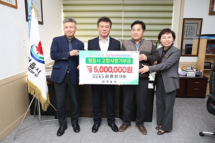 정읍 대성축산 김형완(57) 대표가 지난 12일 정읍시에 고향사랑기부금 500만원을 기탁했다. 500만원은 개인이 고향사랑기부제에 기부 가능한 최고한도다.