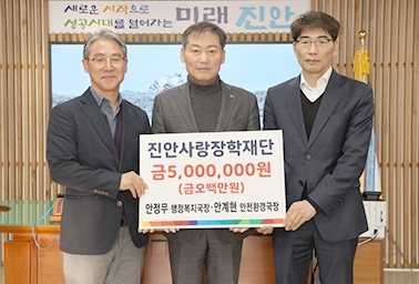 진안사랑장학재단(이사장 전춘성)은 진안군청 안정무 행정복지국장과 안계현 안전환경국장이 장학금 5백만원을 전달했다고 15일 밝혔다.