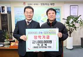 부안군 계화면 돈지3마을 이금배 이장은 지난 15일 부안군 근농인재육성재단을 방문하여 지역 인재육성을 위한 장학금 100만원을 기탁했다.