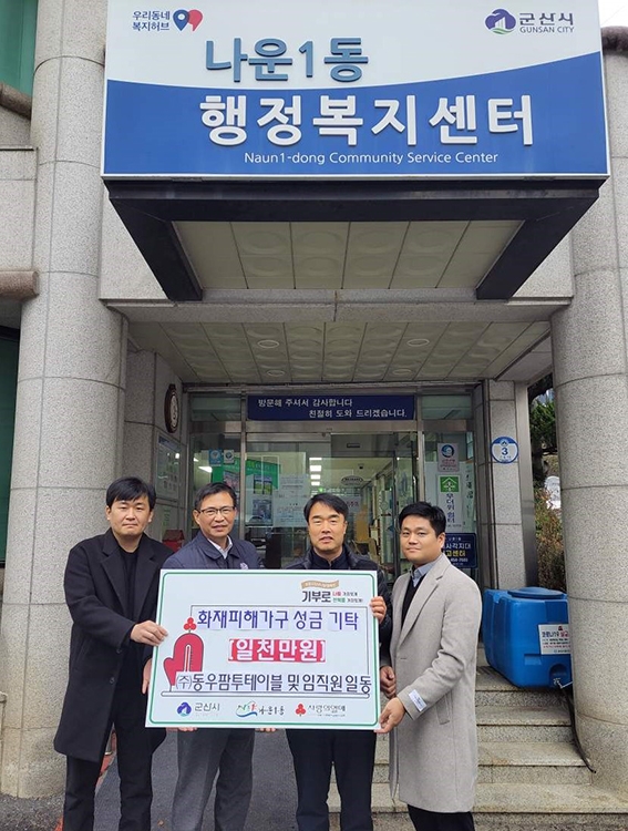 군산시 나운1동은 지난 18일 ㈜동우팜투테이블 임직원이 나운1동행정복지센터를 방문하여 화재 피해 가구를 위한 성금 기탁식을 가졌다고 전했다.
