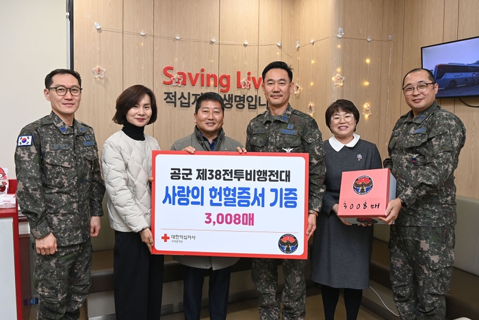 공군 제38전투비행전대(이하 ‘38전대’)가 전북혈액원 군산센터 ‘헌혈의 집’에 방문해 헌혈증 3008장을 기부했다.