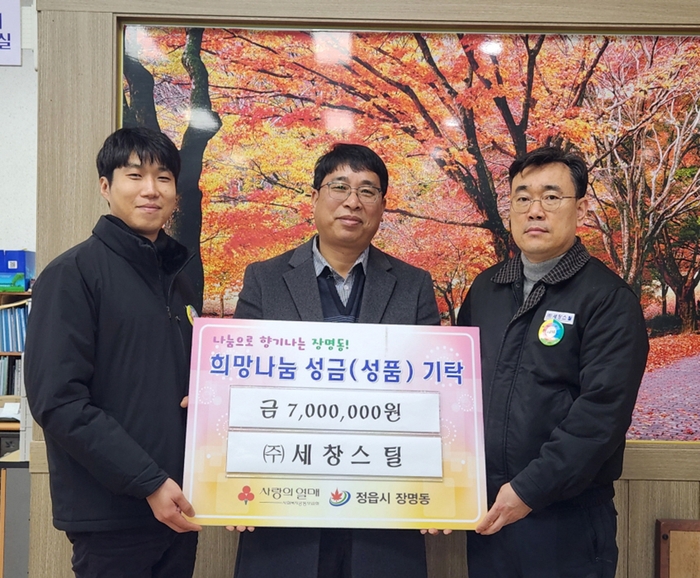 전북 정읍시 제2공단에 소재한 강관 제조업체 ㈜세창스틸(대표 이재선)은 23일 어려운 이웃에게 따뜻한 마음을 전하기 위해 장명동 행정복지센터에 성금 700만원을 전달했다.