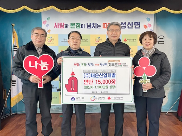 군산시 성산면은 새해 24일, ㈜대운산업개발(대표 함경식)이 난방취약계층을 위해 연탄 15,000장(1,200만원 상당)을 기부했다고 밝혔다.