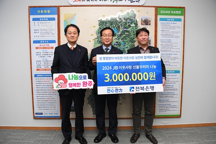 JB전북은행이 ‘2024 이웃사랑 선물꾸러미 나눔’ 사업 일환으로 완주군에 300만 원 상당의 선물꾸러미를 전달했다.