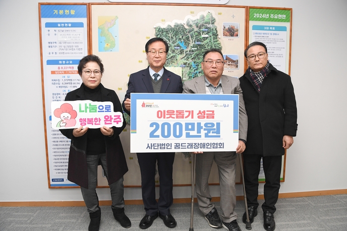 (사)꿈드래장애인협회(회장 하태복)가 완주군에 이웃돕기 성금 200만 원을 전달했다.