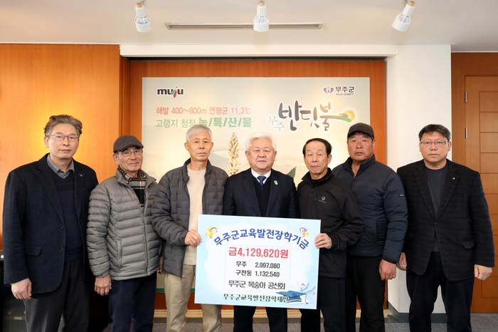 무주복숭아공선회 조직인 무주공선회(회장 한상철)와 구천동공선회(회장 조지현) 회원들이 지난 2일 무주군교육발전장학재단(이사장 황인홍)에 장학금을 전달해 지역사회에 귀감이 되고 있다.