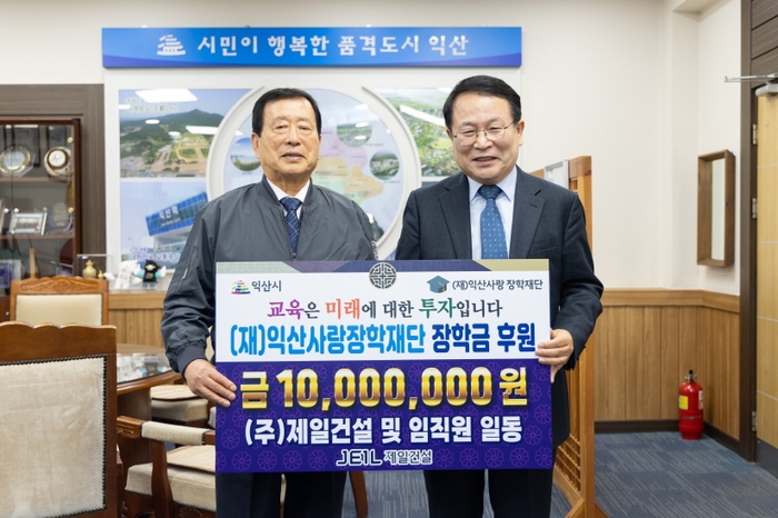 ㈜제일건설(대표이사 윤여웅)이 15일 (재)익산사랑장학재단에 장학금 1,000만 원을 기탁했다.