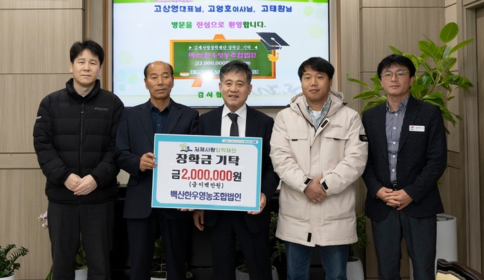 김제사랑장학재단(이사장 정성주)은 백산한우영농조합법인(대표 고상영)가 16일 지역의 우수 인재 양성을 위한 장학금 200만원을 기탁했다고 밝혔다.