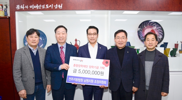 전주지방법원 남원지원 조정위원회(회장 김동범)가 2월 20일 춘향장학재단(이사장 최경식)에 장학금 500만원을 기탁했다. 재작년에 이은 장학금 기탁은 남원시 인재양성을 위해 지속적인 관심을 가지고 올해도 이어졌다.