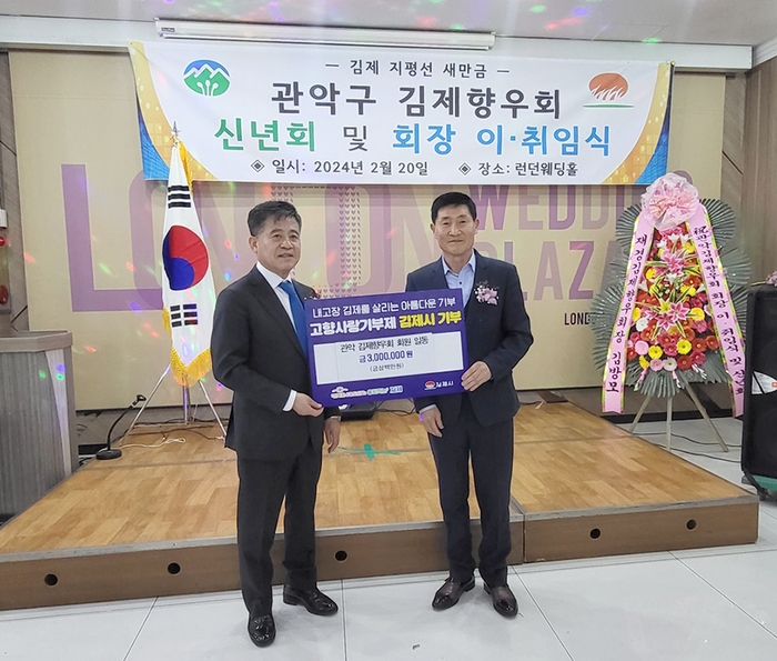 김제시(시장 정성주)는 지난 20일 관악김제향우회가 회장 이·취임식 및 신년회 행사에서 정진근 신임 회장을 비롯해 회원들이 중심이 되어 고향사랑기부금 3백만원을 기탁했다고 밝혔다.