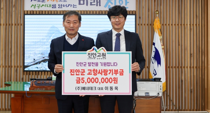 4일 ㈜베네테크 대표 이동옥 씨 외 1명이 진안군(군수 전춘성)을 방문하고 각각 고향사랑기부금 5백만원을 전달했다.