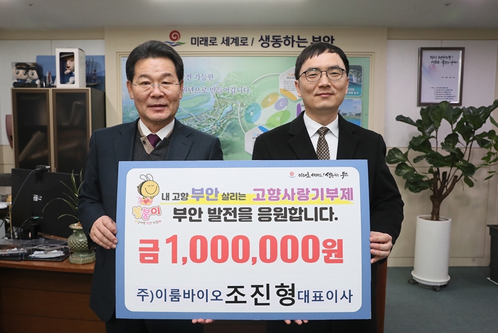 부안군은 지난 4일 조진형 ㈜이룸바이오 대표가 부안군 고향사랑기부금 100만원을 기탁했다고 밝혔다.