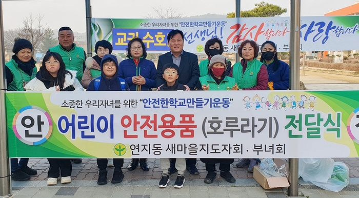 정읍시 연지동 새마을회(협의회장 은종광·부녀회장 박광애)는 지난 4일 정읍서초등학교 앞에서 학생들에게 호루라기를 전달했다.