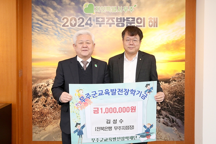 무주군은 7일 김성수 씨(전북은행 무주지점장)가 무주군교육발전장학재단에 사재로 장학금 1백만 원을 기탁했다고 밝혔다.