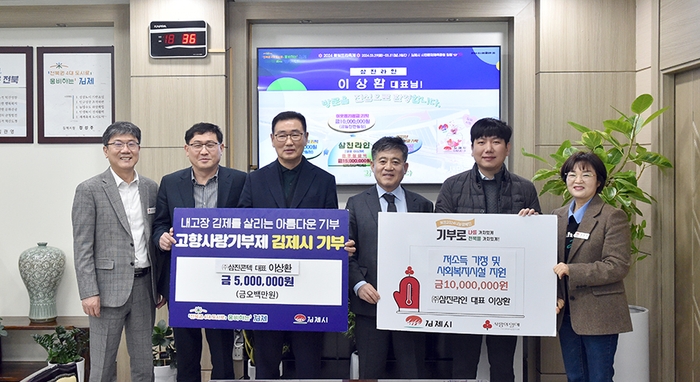 ㈜삼진라인 이상환 대표가 김제시(시장 정성주)에 고향사랑기부금 500만원과 저소득 가정을 위해 사용해 달라며 이웃돕기 성금 1천만원을 기탁했다.