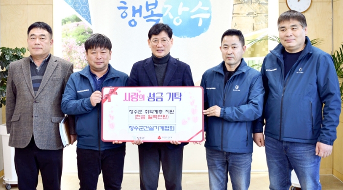 장수군 건설기계협회(회장 한규우)는 지난 7일 군을 방문해 취약계층 지원 등 어려운 이웃을 위해 사용해 달라며 성금 100만원을 기탁하고, 이후 최훈식 군수와 간단한 차담을 통해 현장의 의견을 나눴다.