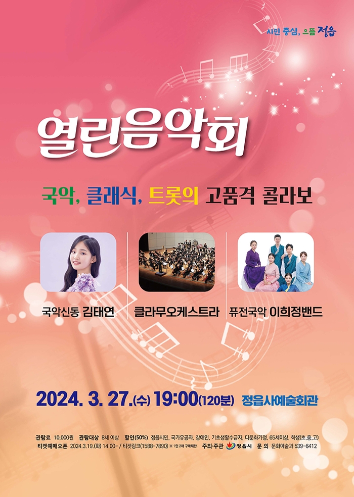 공연은 미스트롯2 TOP 4위의 국악 신동 김태연, 35인조 클라무오케스트라(지휘 유수영), 6인조 퓨전국악 이희정 밴드가 펼친다.