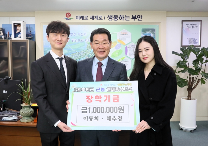 부안군 부안읍 이동희·채수경씨 가족은 지난 22일 부안군 근농인재육성재단을 방문해 지역인재 육성을 위한 장학금 100만원을 기탁했다.