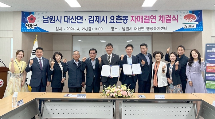 김제시 요촌동 행정복지센터는 남원시 대산면과 문화⸱관광⸱행정⸱경제 등 분야별 상생 협력을 위한 자매도시 협약식을 맺었다고 26일 밝혔다.