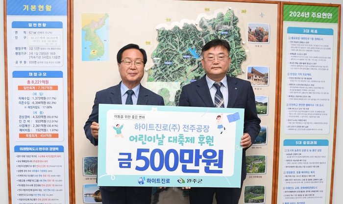 지난달 30일 완주군청 군수실에서 열린 기탁식에는 유희태 완주군수, 신민철 ㈜하이트진로 전주공장장을 비롯해 직원들이 참석해 올해 102회가 되는 어린이날을 축하했다.