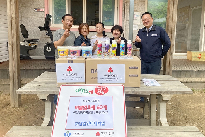 가정의 달 이웃을 생각하는 마음들로 무주군이 훈훈하다. 무주군에 따르면 무풍면 ㈜남일인터네셔널(무풍면 소재, 천연목욕소금, 거품목욕제 생산 등 입욕제 전문기업)은 어린이 날을 기념해 무풍면 아침해지역아동센터 이용 아동 22명에게 이스라엘 사해소금이 함유된 플레이 버블클렌저를 선물했다.