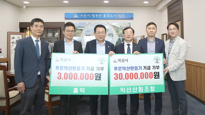 기부금은 익산산림조합 3,000만 원과 홍익 300만 원으로 ㈔푸른익산가꾸기 운동본부에 기탁된 후, '녹색도시 조성을 위한 500만 그루 나무심기'를 위한 나무식재에 활용될 예정이다.