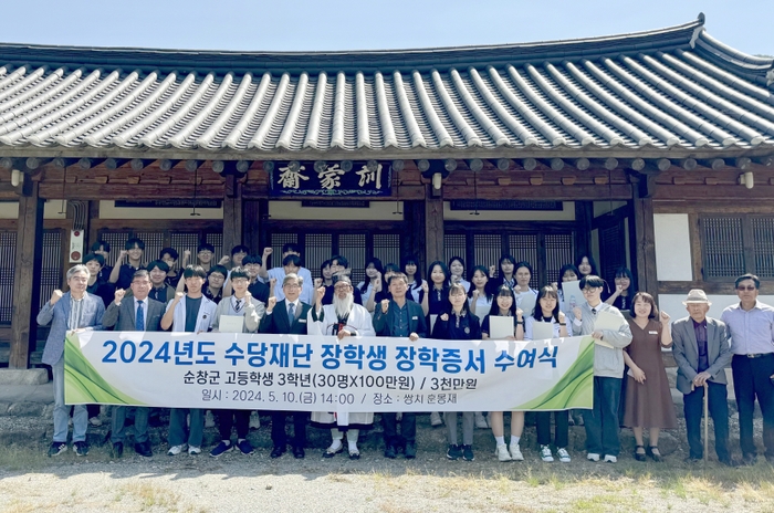 삼양그룹 장학재단인 수당재단(이사장 김윤, 삼양그룹 회장)이 최근 쌍치면 훈몽재에서 순창군 관내 고등학생 30명에게 1인당 100만원씩 3천만원의 장학증서 수여식을 개최했다.