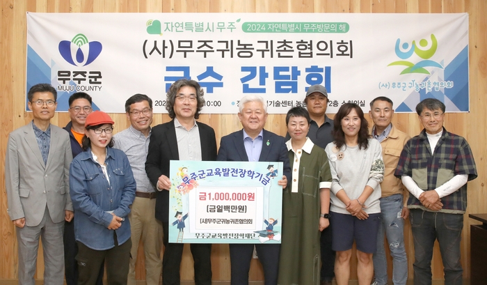 (사)무주군귀농귀촌협의회가 지난 13일 간담회 개최 후 (재)무주군교육발전장학재단 측에 장학금 1백만 원을 기탁했다.