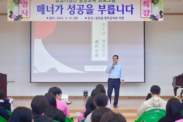 완주군의회 김규성 의원이 지난 21일 완주 세인고등학교에서 교직원 및 전교생 200여 명을 대상으로 ‘청소년 예절함양’이라는 주제로 특강을 실시했다.