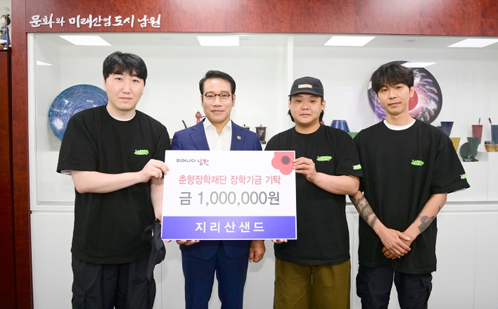 지리산 샌드가 지난 30일 남원시청을 방문해 남원의 인재양성을 위하여 춘향장학재단(이사장 최경식)에 장학금 100만원을 기탁하였다.