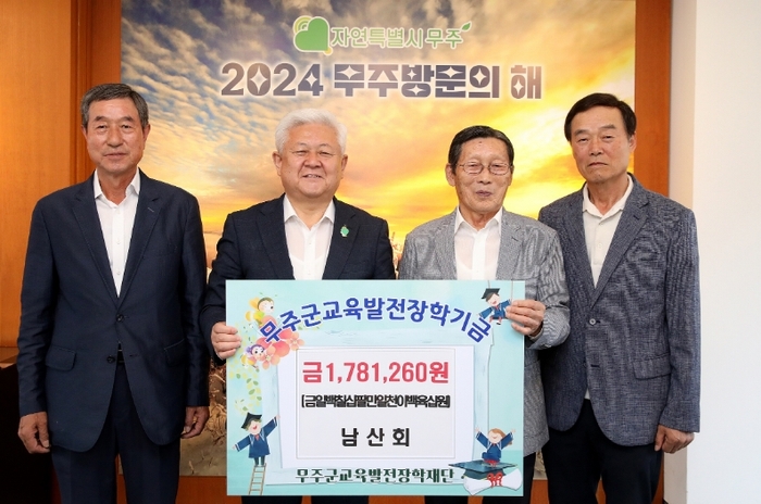 무주군은 지난 10일 무주읍 ‘남산회’에서 무주군교육발전장학재단에 장학금 1,781,260원을 기탁했다고 밝혔다.