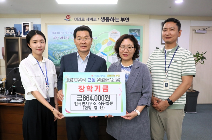 부안군 진서면사무소(면장 김선) 직원들은 지난 7일 부안군 근농인재육성재단에 지역인재육성을 위해 써달라며 장학금 664천원을 기탁했다.