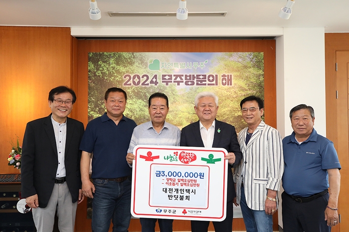 무주군은 대전 개인택시 반딧불회 회원들이 지난 21일 무주군교육발전장학재단에 장학금 1백5십만 원, 무주군에 어려운 이웃돕기 성금 1백5십만 원을 각각 기탁했다고 밝혔다.