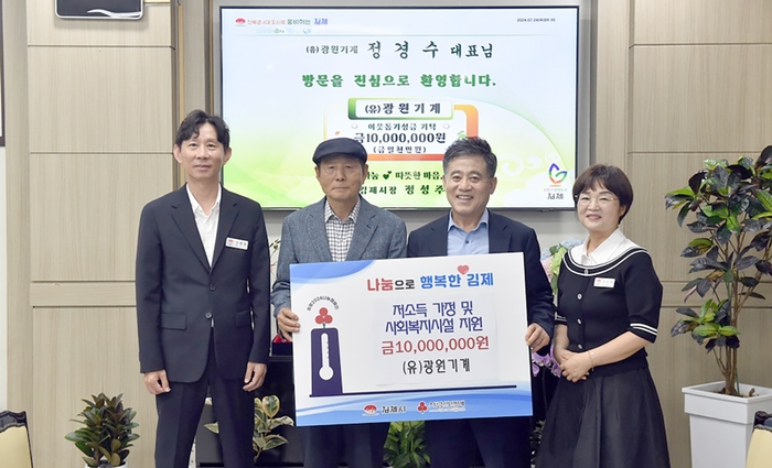 정성주 김제시장은 “경기 악화로 어려운 상황에서도 이웃에게 관심을 갖고 성금을 기탁 해주신 (유)광원기계에 감사드리며, 기탁해 주신 성금은 지역 내 저소득 가정과 취약계층에 잘 전달하겠다”고 전했다.