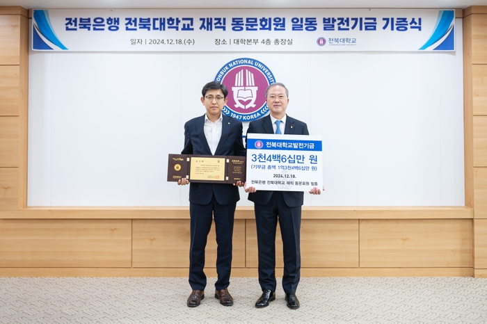 JB금융그룹 전북은행(은행장 백종일) 재직 ‘전북대학교 동문회’ 일동은 18일 전북대학교(총장 양오봉)에 대학 경쟁력 향상을 기원하며 모교발전기금 3,460만원을 전달했다고 밝혔다.