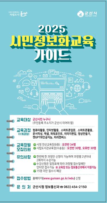 군산시는 시민들의 디지털 정보격차를 해소하고, 실생활에 밀접한 정보화 능력 배양을 위해 2025년도 시민정보화교육을 올해 1월 13일부터 12월 12일까지 무료로 실시한다.