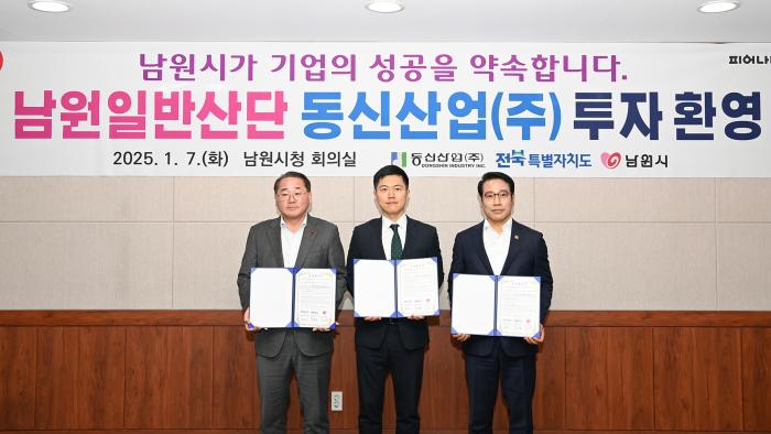 이날 협약식은 남원시청에서 김종훈 전북자치도 경제부지사와 최경식 남원시장, 오영윤 동신산업㈜ 대표 등이 참석한 가운데 진행됐다.