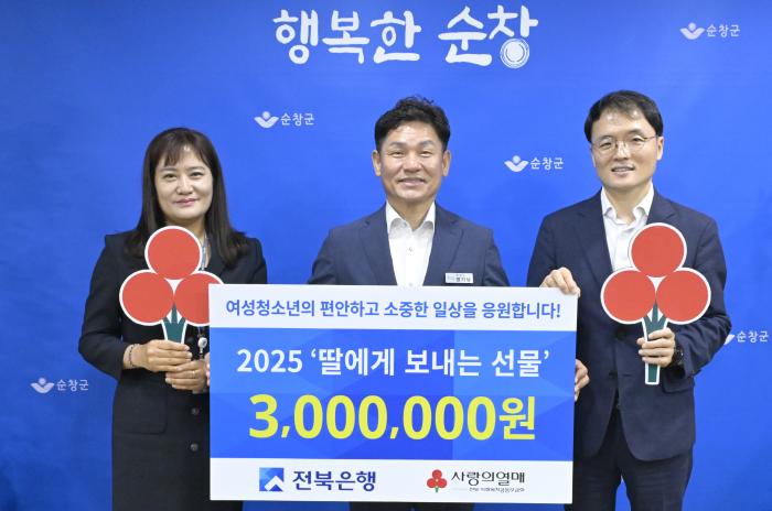김기석 전북은행 순창지점장은 “2020년부터 ‘딸에게 보내는 선물’ 사업을 통해 여성청소년들이 꿈과 희망을 잃지 않고 성장할 수 있도록 지원하고 있다”면서, “앞으로도 지속적인 나눔 활동을 통해 지역사회와 함께하는 전북은행이 되겠다”고 밝혔다.
