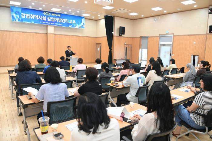 이번 교육은 감염취약시설의 감염관리 기반을 구축하고, 감염병 대응 역량 강화를 위해 보건소에서 매년 실시하는 교육으로 고위험군이 상시 거주해 집단감염의 위험성이 높은 요양병원, 장기요양기관, 장애인복지시설 등 관내 감염취약시설 약 60개소 대표자 및 방역관리자들이 참석했다.