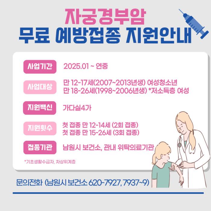 남원시보건소는 자궁경부암 예방을 위해 여성 청소년 및 저소득층(기초생활수급자, 차상위계층) 여성 대상으로 무료 예방접종을 시행하고 있다.