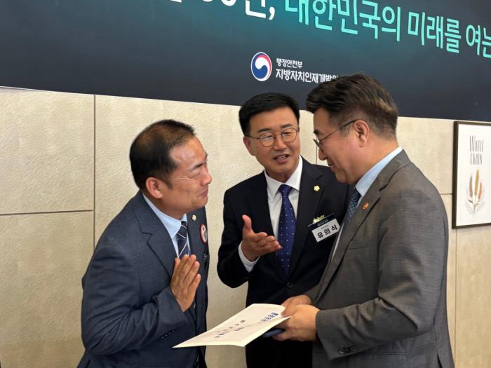 완주군의회 유의식 의장과 완주전주통합반대특별위원회 서남용 위원장은 3일 이서면 지방자치인재개발원 개원 60주년 행사에서 윤호중 행정안전부 장관을 만나 ‘완주·전주 행정통합 반대’ 건의서를 직접 전달하고, 정부 차원의 신속한 결단을 촉구했다.
