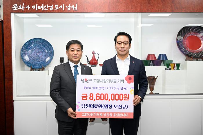 오진규 원장은 “남원의료원은 남원시민의 건강을 책임지는 공공기관으로서, 기부문화 확산과 지역 발전에 동참하고자 이번 단체 기부를 추진하게 됐다. 고향사랑기부 참여가 남원시민들의 복지증진에 도움이 되길 바란다”고 기부 소감을 밝혔다.