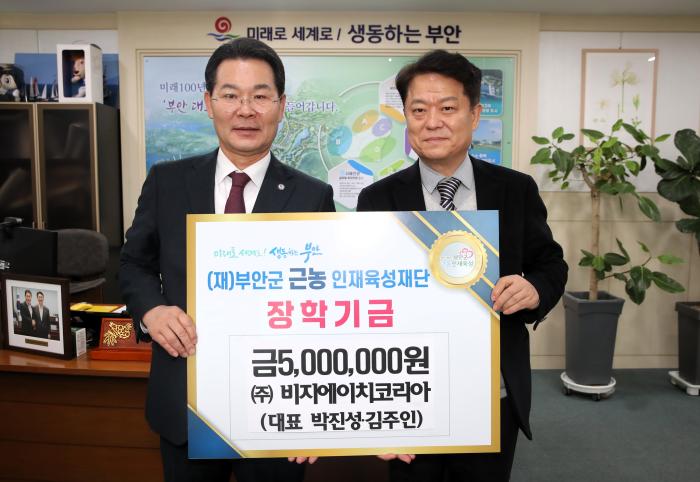 ㈜비지에이치코리아(대표 박진성·김주인)는 지난 10일 부안군근농인재육성재단을 방문해 지역 학생들을 위한 장학금 500만원을 기부했다.
