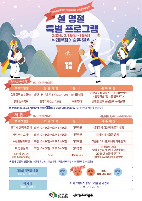완주군 삼례문화예술촌이 설 명절을 맞아 오는 15일부터 16일까지 이틀간 전통문화와 현대적 콘텐츠를 결합한 ‘설 명절 특별 프로그램’을 운영한다.