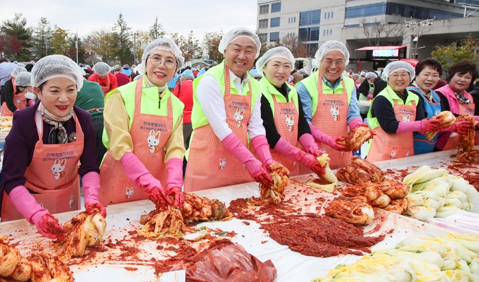 전북농협(본부장 김영일)은 김관영 도지사, 국주영은 도의장, 서거석 교육감, 온정이 전북여성단체협의회장, 목영숙 도지사 부인, 유광수 교육감 부인 및 14개 시장·군수 부인, 김원철 농협중앙회 이사, 장경민 농협은행 전북본부장, (사)우리농업지키기운동본부(위원장 박병철), 농가주부모임(회장 김미자), 고향주부모임(회장 김경리) 등 400여명과 함께 9일 전북도청 야외공연장에서 '2023년 사랑의 김장나눔 축제'를 개최했다.