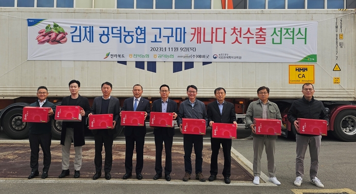 전북도(도지사 김관영)와 전북농협(본부장 김영일)은 공덕농협(조합장 문용수) 함께 고구마를 CA컨테이너를 활용해 캐나다로 첫수출하는 선적식을 9일 공덕농협 산지유통센터에서 가졌다.