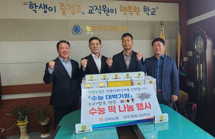 전북농협(본부장 김영일)은 수능일을 앞둔 15일 전주 영생고등학교(교장 이장훈)에서 지역의 미래 인재를 응원하고자 '우리 쌀로 만든 수능 떡 나눔 행사'를 가졌다.