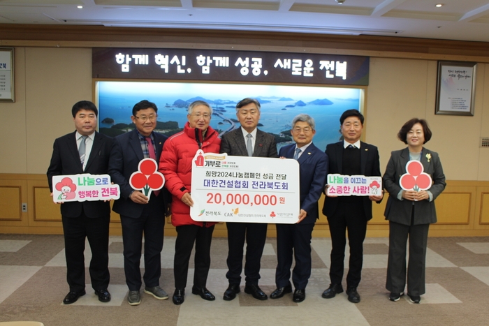 대한건설협회 전라북도회(회장 소재철)는 세밑을 앞두고 지역의 취약계층과 소외된 이웃들을 돕기 위해 6일 전북도청을 방문 김관영 도지사에게 이웃돕기 성금 2천만원을 전달했다.