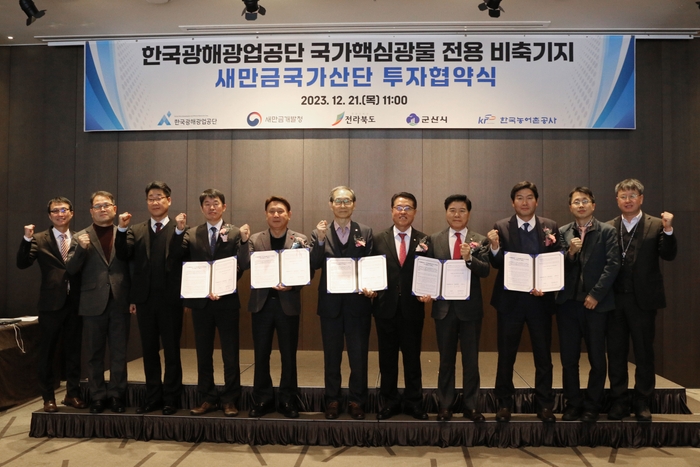 새만금개발청(청장 김경안)과 전북도.군산시.한국농어촌공사는 21일 한국광해광업공단과 ‘국가 핵심광물 전용 비축기지 구축 사업’을 위한 투자협약을 체결했다고 밝혔다.