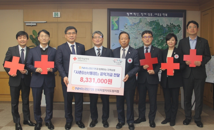 NH농협은행(전북본부장 이정환)는 14일 사촌(社村)통장 공익기금 8백33만1천원을 대한적십자사 전북특별자치도지사(회장 이선홍)에 전달했다.